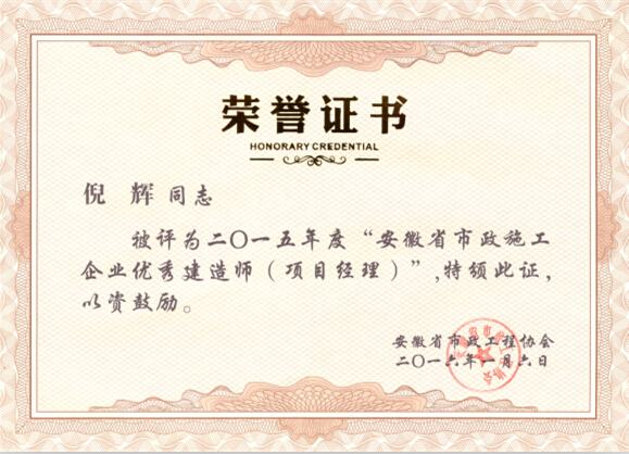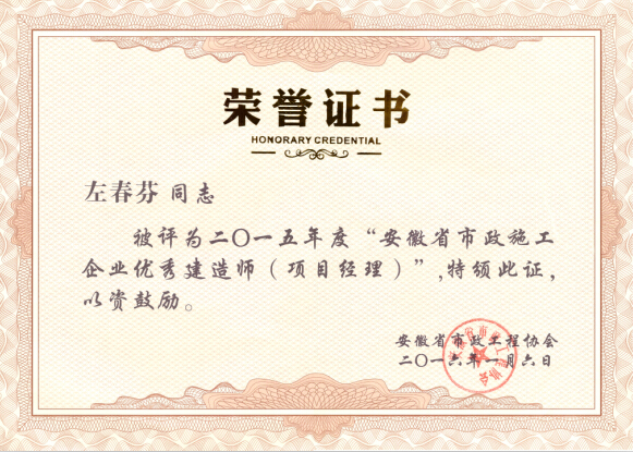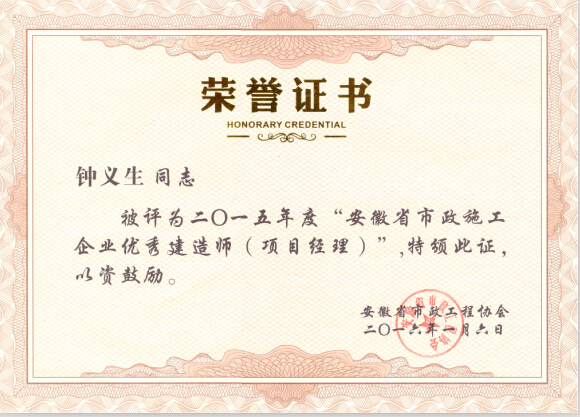 在安徽省市政工程協會組織評選的2015年度“安徽省市政施工企業優秀項目經理”活動中,我公司鐘義生、倪輝、左春芬三位同志獲得此項殊榮,此次全省共評選出66位市政優秀項目經理,我公司斬獲三枚獎狀,再次祝賀以上三位同志。