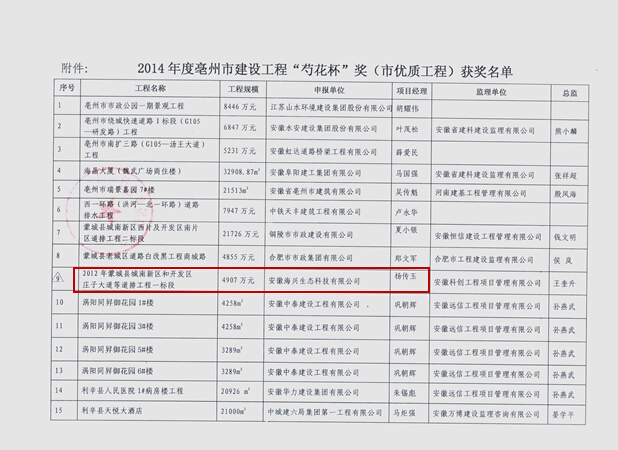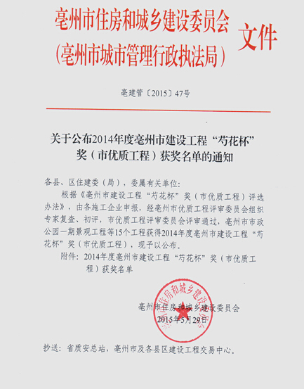 近日,自亳州市住建委獲悉,我公司承建的“蒙城縣城南新區和開發區莊子大道等道排工程一標段”榮獲2014年度亳州市建設工程“芍花杯”獎。