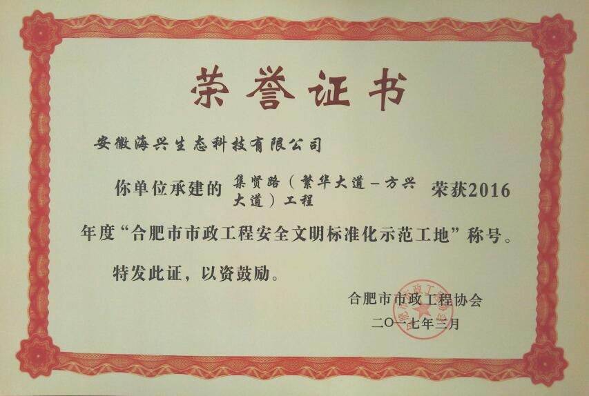 近日,集賢路(繁華大道-方興大道)工程榮獲“市政工程安全文明標(biāo)準(zhǔn)化示范工地”,是2016年合肥市首次開(kāi)展評(píng)比市政工程20個(gè)示范工地之一。