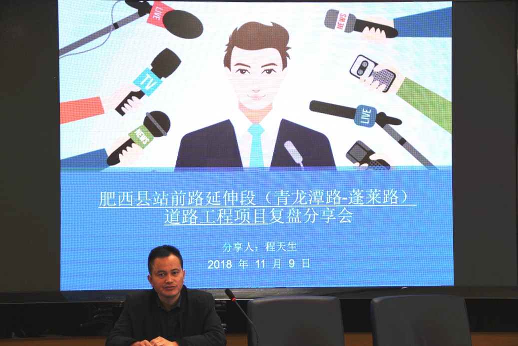 11月9日下午,陽光明媚,氣候宜人。在聯海集團5樓會議室召開項目經理復盤分享會,此次分享的嘉賓是肥西縣站前路道路工程項目經理程天生同志;集團公司施工、監理、檢測板塊和職能部門全體員工參加了此次會議,會議在祥和熱烈的氣氛中進行。