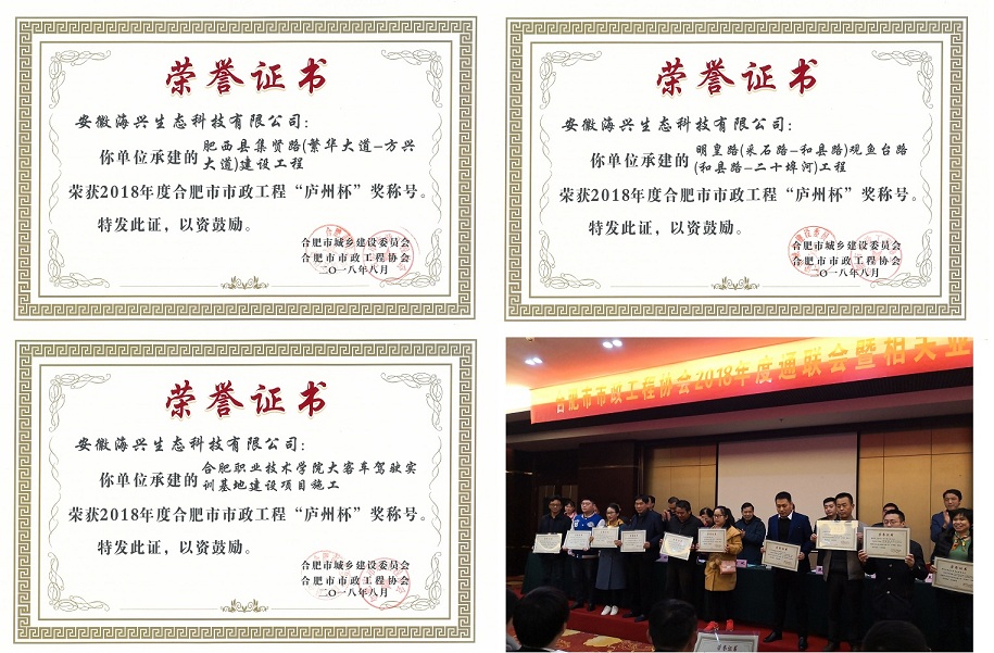 2018年11月15日,從合肥市市政工程協(xié)會(huì)2018年度通聯(lián)會(huì)暨相關(guān)業(yè)務(wù)培訓(xùn)會(huì)議上傳來(lái)喜訊,我司承建的合肥市瑤海區(qū)明皇路、和縣路、觀魚(yú)臺(tái)路工程,合肥職業(yè)技術(shù)學(xué)院大客車(chē)駕駛實(shí)訓(xùn)基地建設(shè)項(xiàng)目,肥西縣集賢路建設(shè)工程,皆榮獲了2018年度合肥市市政工程“廬州杯”獎(jiǎng)。