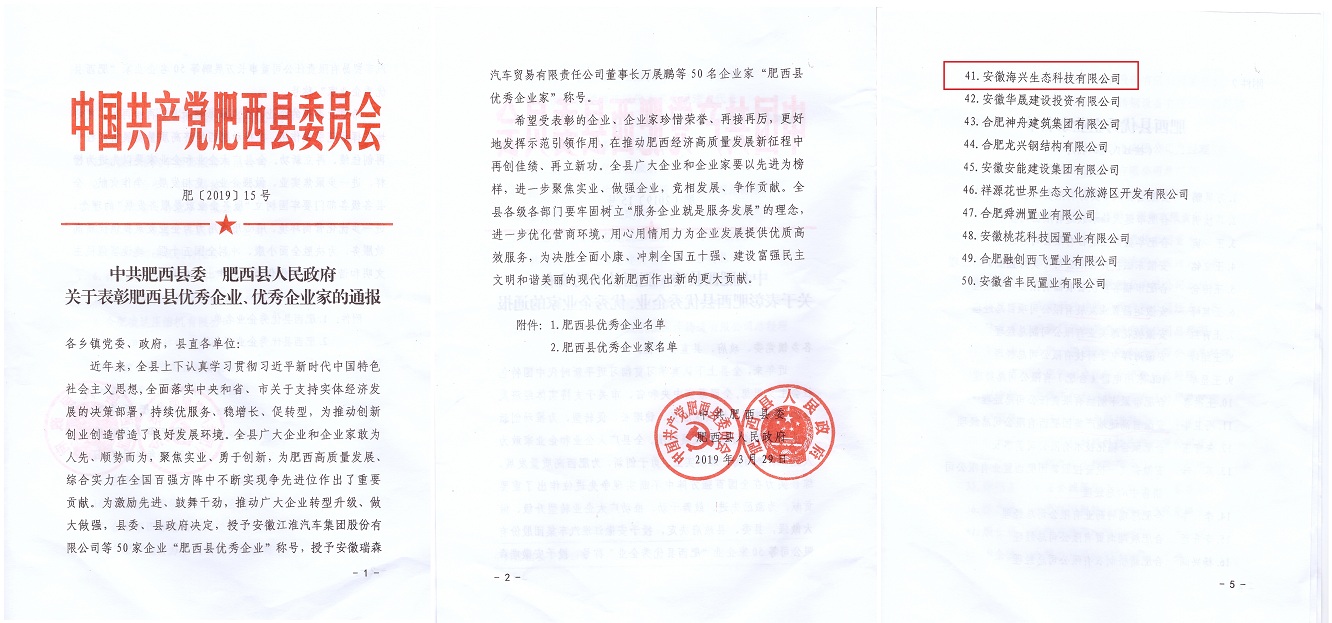 2019年3月30上午9:00整,肥西縣創(chuàng)優(yōu)營商環(huán)境推進高質量發(fā)展大會在縣政府派河劇場隆重召開,并表彰了“肥西縣優(yōu)秀企業(yè)”、“優(yōu)秀企業(yè)家”等先進。我司榮獲“肥西縣優(yōu)秀企業(yè)”稱號。