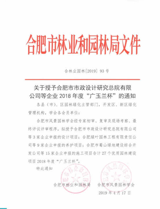 近日,我司承建的阜陽合肥現(xiàn)代產(chǎn)業(yè)園區(qū)蘆橋溝(黃山路-105 國道)花海綠道景觀工程喜獲2018年度合肥市“廣玉蘭杯”獎項。
